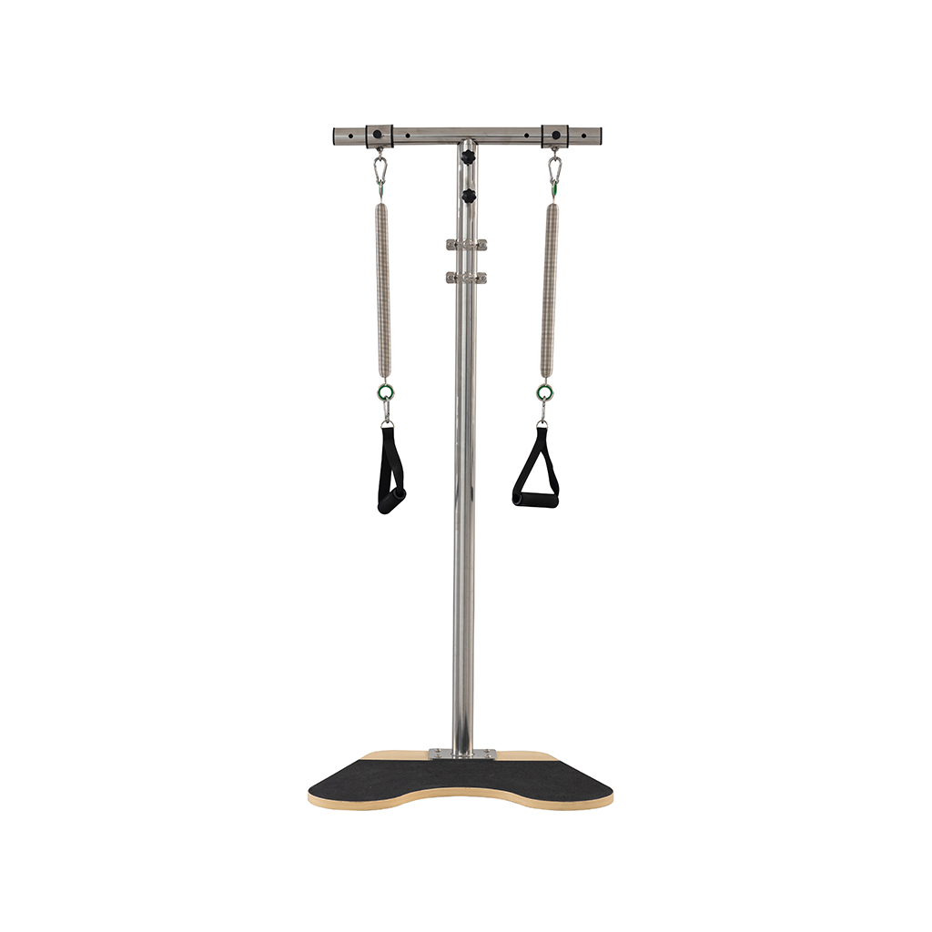 The Ped-O-Pul (Pedi Pole) features adjustable resistance springs connected to ergonomic handles, allowing for a wide range of controlled, resistance-based exercises. These movements target the shoulders, arms, back, and powerhouse while simultaneously challenging balance and stability.