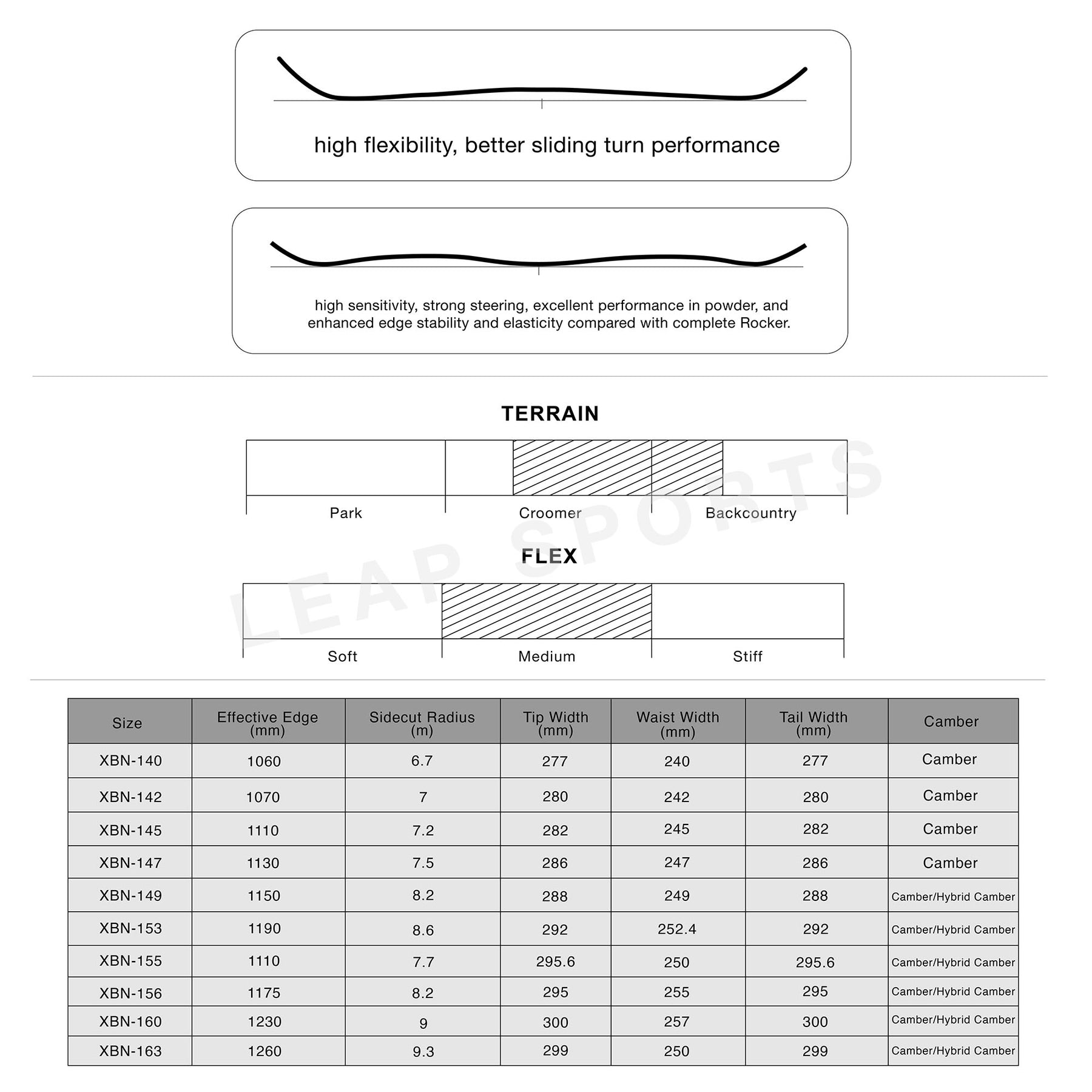 Terrain: All mountain/Powder snow Skill Level: Intermediate - Advanced Shape: True Twin Flex: Medium Core: Poplar/Paulownia Base: Sintered Base
